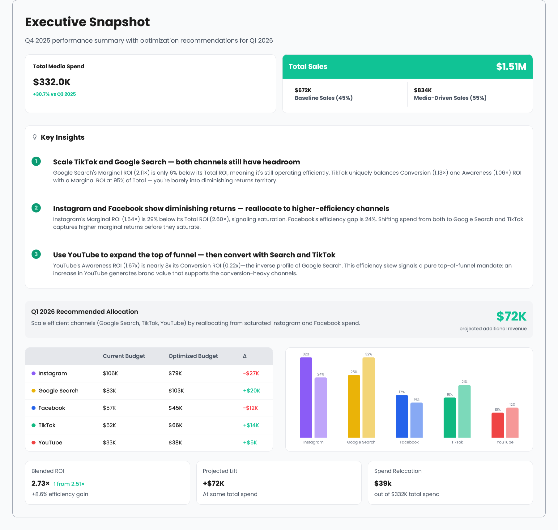 Go from raw channel data to clear budget decisions, faster. Explore performance, understand incremental impact, and share client-ready views without stitching the story together manually.